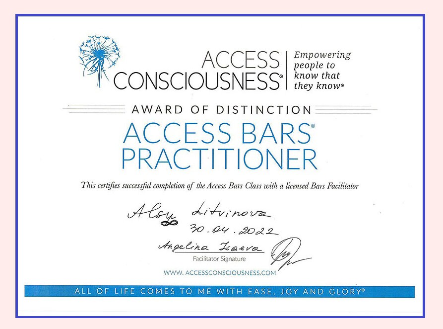 Мой интерес к энергиям зародился ещё с юности, когда я начала лечить себя с помощью медитаций. Я всегда чувствовала, что наше тело — это лишь малая часть чего-то огромного, и изучала всё, что связано с энергией и её воздействием. Позже я усилила работу с физическим телом через технику Аксесс барс и Аксесс фейслифт. Никогда не забуду, как впервые во время сеанса с изумлением наблюдала, как прикосновение к определённой точке на голове изменяет течение энергий во всем теле. Это было по-настоящему волшебно! Расслабляющие сеансы Аксесс помогают избавляться от накопленного стресса и достигать состояния глубокого расслабления.