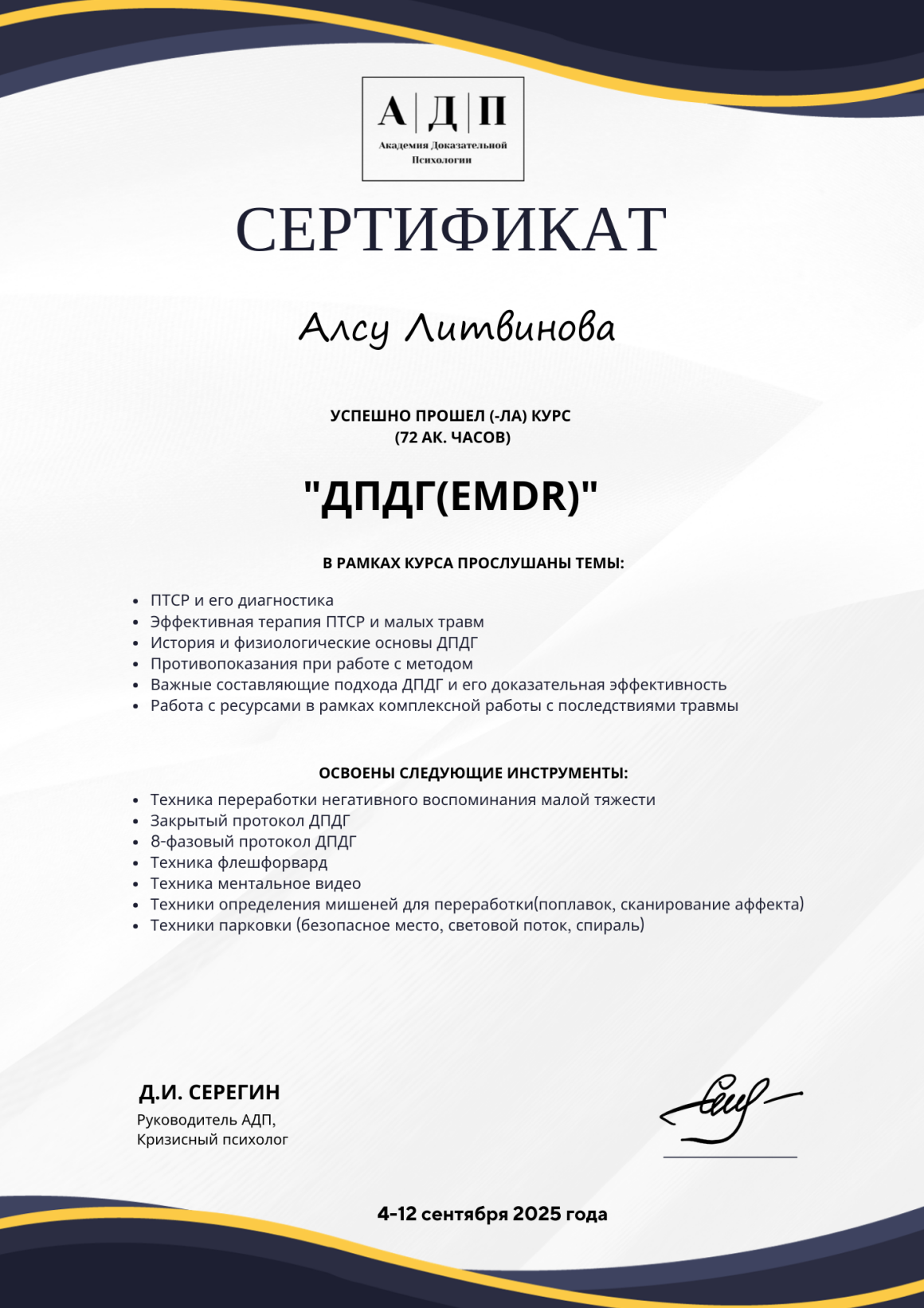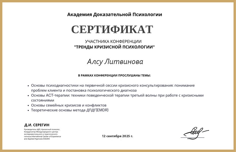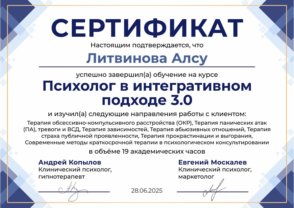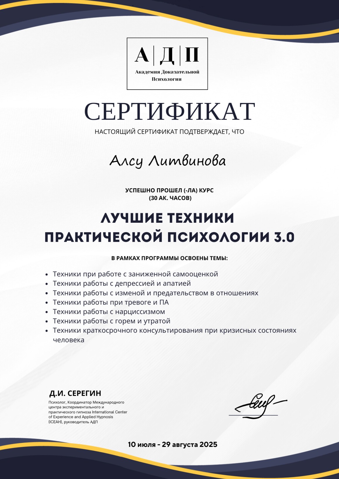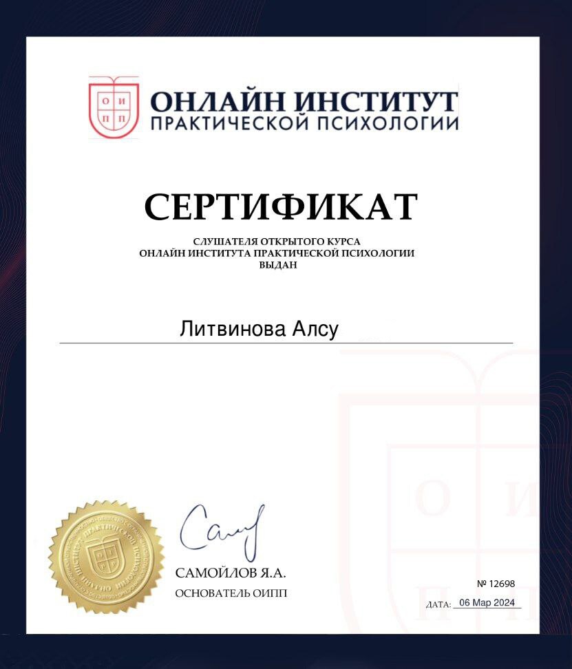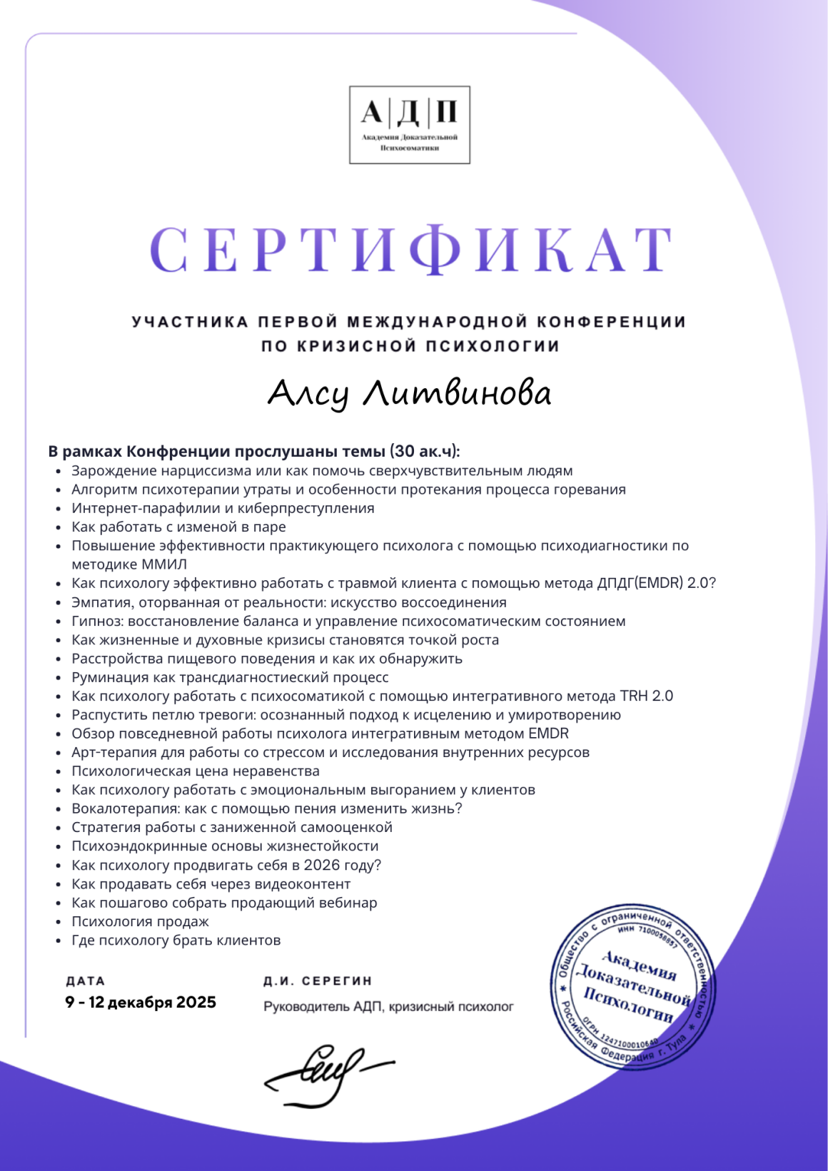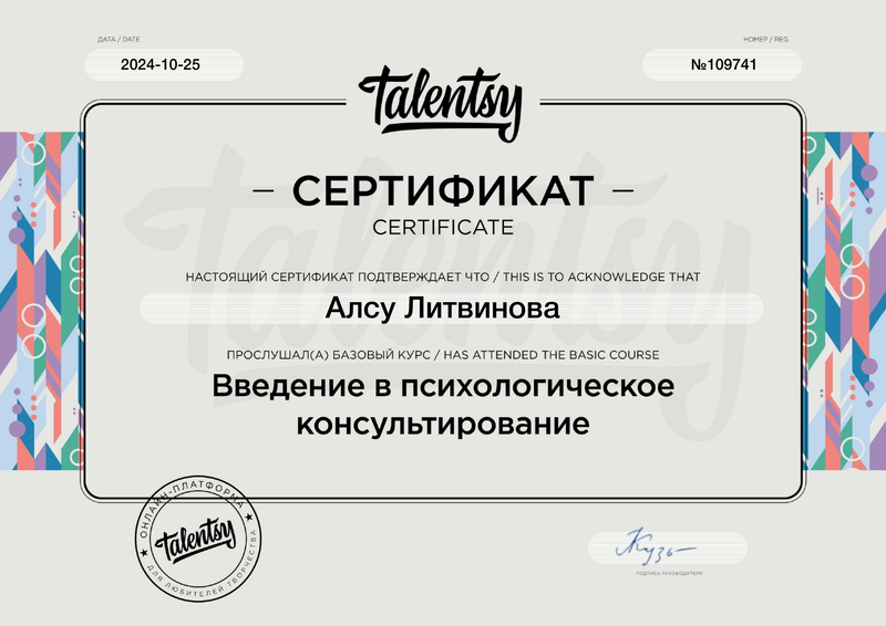 В каждую встречу я вкладываю всю свою энергию, опыт и душевную заботу. Моя цель – помочь Вам открыть новые горизонты и обрести гармонию. У меня Вы всегда получите гарантию конфиденциальности и индивидуальный подход, ведь я верю в уникальность каждого человека. Здесь Вы найдёте пространство для личного роста, исцеления и трансформации, наполненное атмосферой любви, поддержки и взаимопонимания.