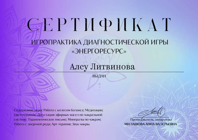 Особое внимание я уделяю трансформационной игре «Энергоресурс», способствующей раскрытию Вашего энергопотенциала и внутренних резервов.